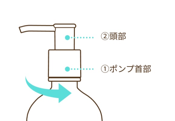 ポンプの首部①を片手で押さえながら頭部②を固定して、矢印の方向(左回り)に回すと頭部が上がります。中身が出るまで、数回カラ押ししてください。頭部②が上がらないときは、首部①を固く締めなおして手で固定し、頭部②を再度回してください。詳細はこちらをご確認ください。以上の作業を数回お試しいただいても回らない場合はお手数ですが、お客様相談室までご連絡ください。